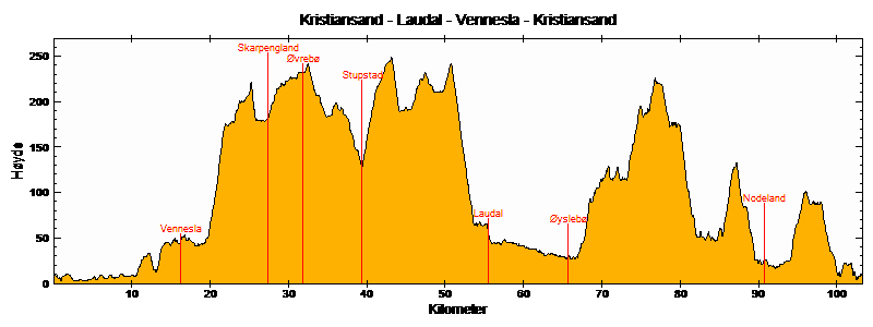 Løypa går over flere heier fra Kristiansand til Marnardal, og er en tung løype med mange klatremeter. Man må opp 4 lange stigninger: over Hellemyr og Vestheiene i Kristiansand, fra Nodeland til Øyslebø, fra Laudal til Stupstad og fra Stupstad til Vennesla. Mellom slagene kommer det enkelte veldig lette og flate partier, f. eks. opp Songdalen, opp Marnardal og ned fra Vennesla.