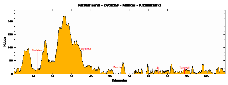 Dette er en løype som kombinerer klatringen mellom dalfører med kystens kuperte terreng. Med like mange klatremeter som f. eks. turen via Laudal og Vennesla gir denne løypen likevel et flatere inntrykk i profilen. De mange klatremetrene kommer selvsagt av alle de små, irriterende bakkene langs kysten, hvor det er umulig å få noen god flyt.