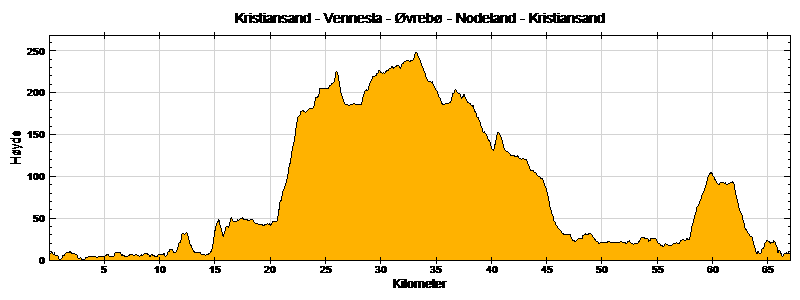 Ruten går fra Kristiansand til Vennesla via Sødalssiden og Ravnås (dvs. østsiden av Otra fra Kristiansand og deretter vestsiden av Otra fra Kvarstein). Den første bakken kommer ved Drivenes, og turen går videre forbi Skarpengland til Stupstad. Rett før Stupstad kommer den første nedoverbakken, og deretter går det jevnt nedover mot Nodeland. Fra Brennåsen følger ruten sykkelstien langs E39 tilbake til Kristiansand.