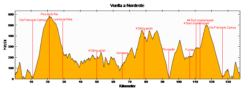 Elvedalene og den dårlige asfalten fortsetter å gi oss utfordringer på østkysten mellom Nordeste og Agua Retorta. Etterhvert kommer vi oss opp i høyden og kan skue opp på Pico da Vara (1103 moh), det høyeste fjellet på São Miguel. Etter 87 km går det nedover mot Povoaçao, og da snakker vi nedover! Her skal vi kvitte oss med 450 moh på 6 km. Pass på asfalten -- den er fremdeles like dårlig og blir direkte farlig i utforkjøringene.