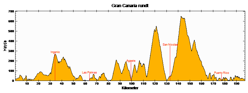 Med utgangspunkt i Maspalomas starter vi vestover på GC-500 og følger den forbi Puerto Rico til Puerto Mogan, hvor GC-200 overtar. Her begynner også bakkene med to små fjelloverganger på de neste 16 kilometrene, med høyeste topp på ca 650 moh.