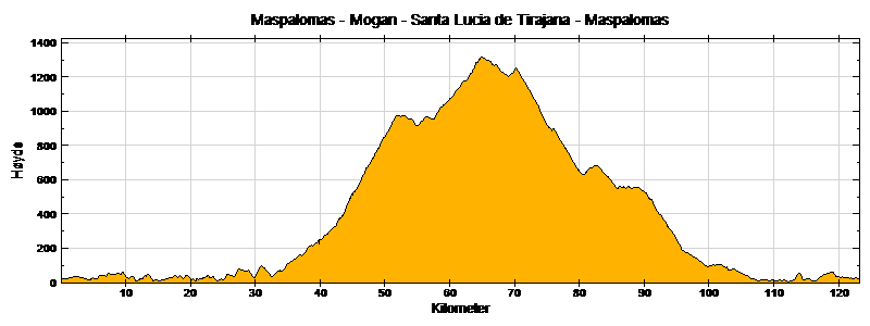 Med start i Maspalomas kjører vi vestover langs kysten forbi Puerto Rico til Mogan. Rett etter Mogan tar vi til høyre mot San Bartolomé og Tejeda på en dårlig asfaltert vei som stiger kraftig de første kilometrene. Terrenget flater etterhvert ut, men asfalten forblir dårlig i ganske mange kilometer før vi kommer ut på hovedveien igjen rett ved Ayacata. Siden vi nå er ca halvveis på turen og det for det meste er nedoverbakke som gjenstår, passer det fint med en lunsjpause i Ayacata.