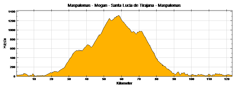Med start i Maspalomas kjører vi vestover langs kysten forbi Puerto Rico til Mogan. Rett etter Mogan tar vi til høyre mot San Bartolomé og Tejeda på en dårlig asfaltert vei som stiger kraftig de første kilometrene. Terrenget flater etterhvert ut, men asfalten forblir dårlig i ganske mange kilometer før vi kommer ut på hovedveien igjen rett ved Ayacata. Siden vi nå er ca halvveis på turen og det for det meste er nedoverbakke som gjenstår, passer det fint med en lunsjpause i Ayacata.