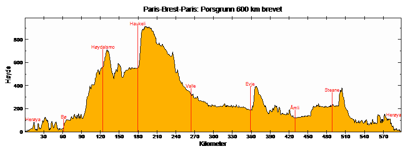600 km kvalifiseringsritt til Paris-Brest-Paris arrangert i Porsgrunn. Veimerkene viser stemplingsstasjoner hvor ankomst skal attesteres av den lokale bensinstasjonen.