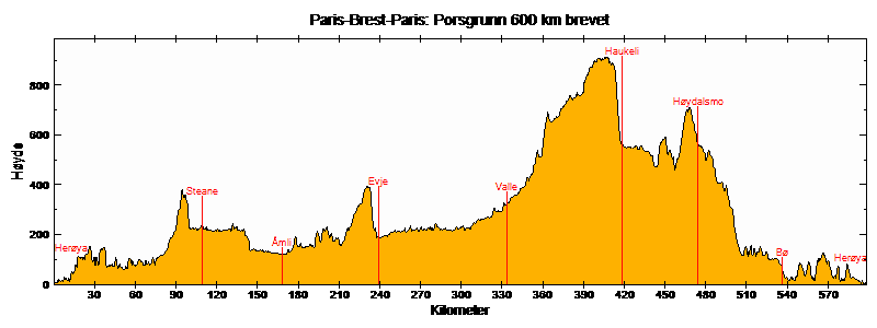 600 km kvalifiseringsritt til Paris-Brest-Paris arrangert i Porsgrunn. Veimerkene viser stemplingsstasjoner hvor ankomst skal attesteres av den lokale bensinstasjonen.