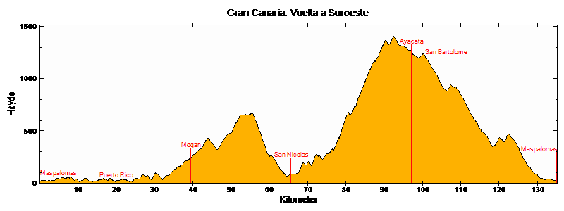 Det er mye nedoverbakke videre og bare fire korte stigninger igjen før vi er nede ved kysten. De fire bakkene kommer etter Ayacata, etter San Bartolomé og etter Fataga (2 stk). Hele turen ned fra toppen til kysten tar omtrent halvannen time. Fra Fataga kommer man ned midt i Playa del Inglés, med mindre man tar til høyre etter motorveibroen og kjører mot Maspalomas og Mogán igjen.