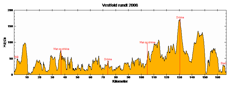Terrenget er varierende hele tiden. Den tøffeste bakken kommer allerede opp fra Holmestrand, men de fleste opplever likevel de siste 6 milene fra Larvik som den tyngste biten.