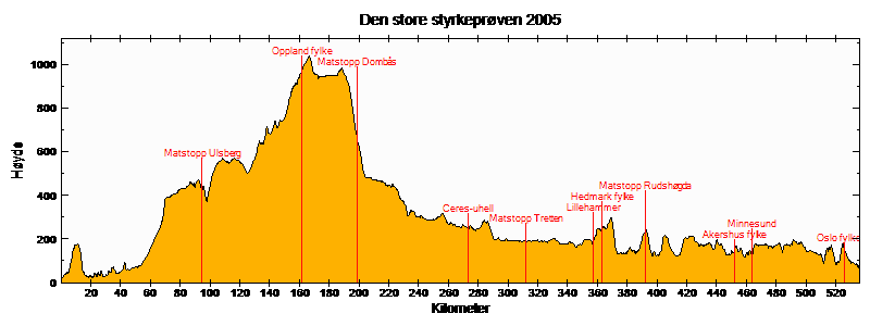 KCK og CK Sør samarbeidet om å sykle Den store styrkeprøven i 2005. Løypeprofilen som er vist her har veimerker etter stoppene vi hadde.