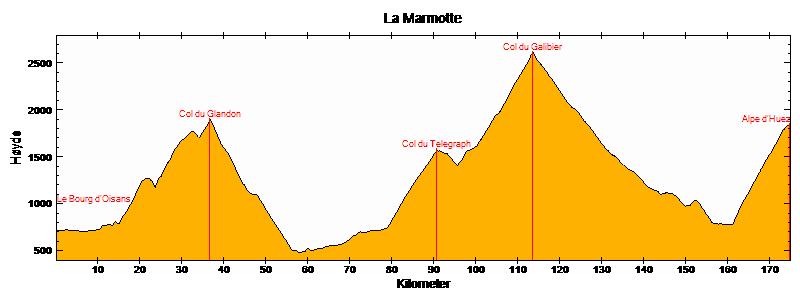 | Col du Galibier | 113,5 km | 61,3 km | 22,8 km | 2618 | 1214 | 170 | |