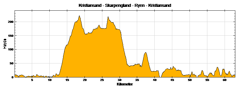 Løypa går opp riksvei 9 fra Kristiansand, forbi Høiekleivene og til Skarpengland. Her tar man til høyre mot Vennesla og følger veien ned Drivenesbakken og over Venneslafjorden til sentrum. I Vennesla tar man til høyre mot Kristiansand i første rundkjøring og deretter rett frem mot Ålefjær i neste. Herfra følger en skilter mot henholdsvis Ryen og Kristiansand, og det siste stykket langs E-18 går på sykkelstien.