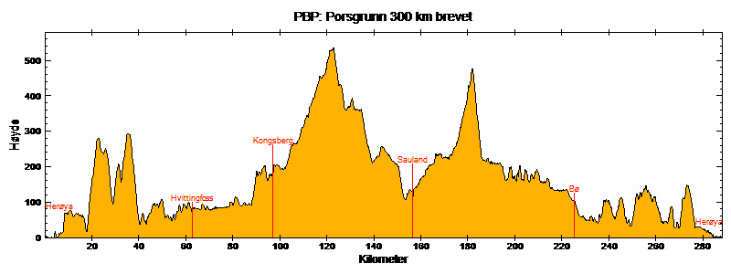 300 km kvalifiseringsritt til Paris-Brest-Paris arrangert av Hydro BIL i Porsgrunn. Veimerkene viser stemplingsstasjoner hvor ankomst skal attesteres av den lokale bensinstasjonen.