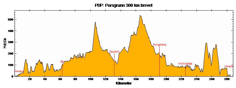 300 km kvalifiseringsritt til Paris-Brest-Paris arrangert av Hydro BIL i Porsgrunn. Veimerkene viser stemplingsstasjoner hvor ankomst skal attesteres av den lokale bensinstasjonen.