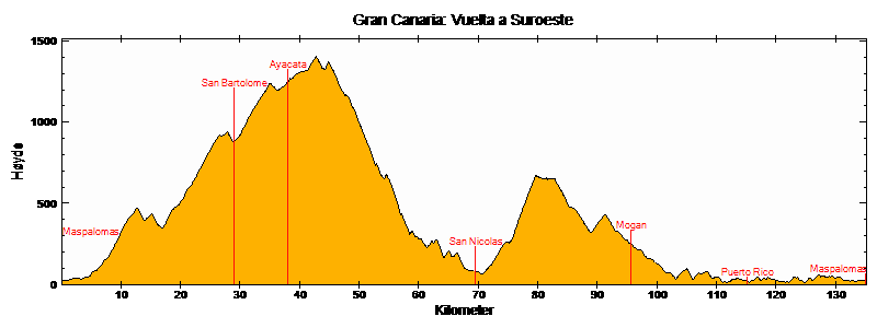 Det er mye nedoverbakke videre og bare fire korte stigninger igjen før vi er nede ved kysten. De fire bakkene kommer etter Ayacata, etter San Bartolomé og etter Fataga (2 stk). Hele turen ned fra toppen til kysten tar omtrent halvannen time. Fra Fataga kommer man ned midt i Playa del Inglés, med mindre man tar til høyre etter motorveibroen og kjører mot Maspalomas og Mogán igjen.